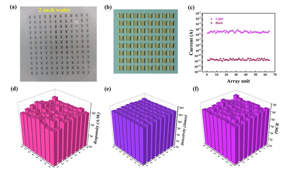 图3. 基于2 英寸氧化镓薄膜晶圆的8×8阵列器件及其主要性能柱状图。