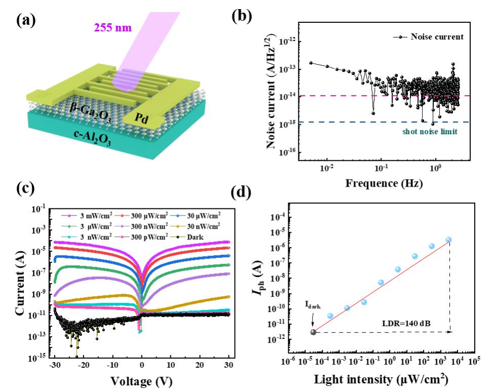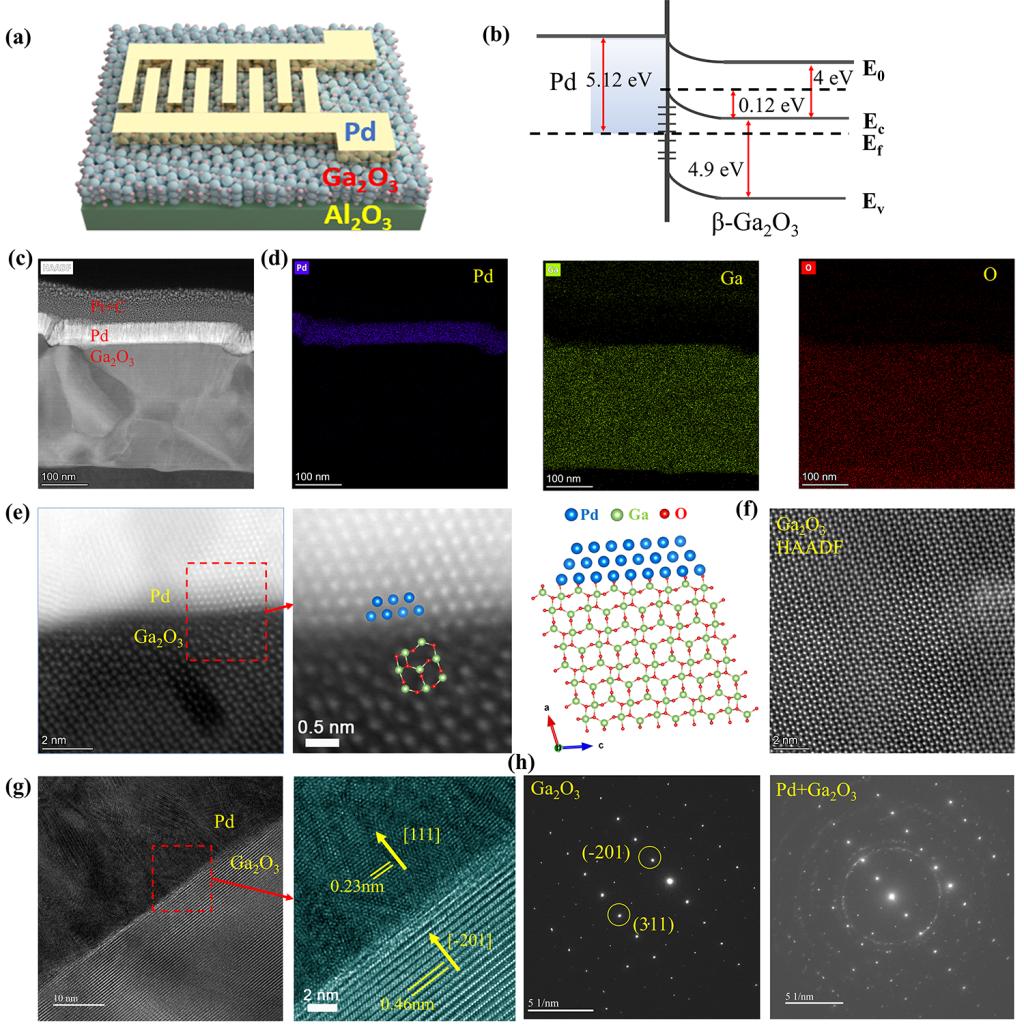 由于日盲紫外光(200~280nm)会被地球的臭氧层强烈吸收,所以在近地表没有日盲紫外成分,因此工作在该波段的光电探测器称为日盲紫外光电探测器。日盲紫外光电探测器因其“太阳光零干扰”特性,可精准探测火焰、电晕放电等微弱信号,在电力安全监测、火灾预警、环境监测、深紫外成像与通信等领域应用潜力巨大。作为一种超宽带隙半导体,氧化镓是一种极具潜力的日盲紫外探测材料。然而,氧化镓光电探测器的缓慢响应速度和较窄线性动态范围,阻碍了它们的商业应用。为解决这些问题,该团队创新采用高功函数金属钯(Pd)叉指电极,结合蓝宝石衬底外延生长的Ga₂O₃薄膜设计构筑了一种新型日盲紫外光电探测器。原子级透射电子显微镜数据表明,Pd-Ga₂O₃界面干净且平滑,由Ga₂O₃单晶和局部Pd单晶组成,有利于削弱费米能级钉扎效应(图1)。低损伤和低缺陷的接触界面提供了出色的光电响应时间(上升时间为 2.4 毫秒,下降时间为 2.6 毫秒)以及 140 分贝的超大线性动态范围(图2)。在 2 英寸的Ga₂O₃薄膜晶圆上制作了12×12 阵列器件,其中所有 64 个(8×8)器件在测试中均保持了稳定的性能和高可靠性(图3)。基于该高性能日盲光电探测器,团队先后开发了智能火灾预警、紫外成像和保密通信等应用验证系统。